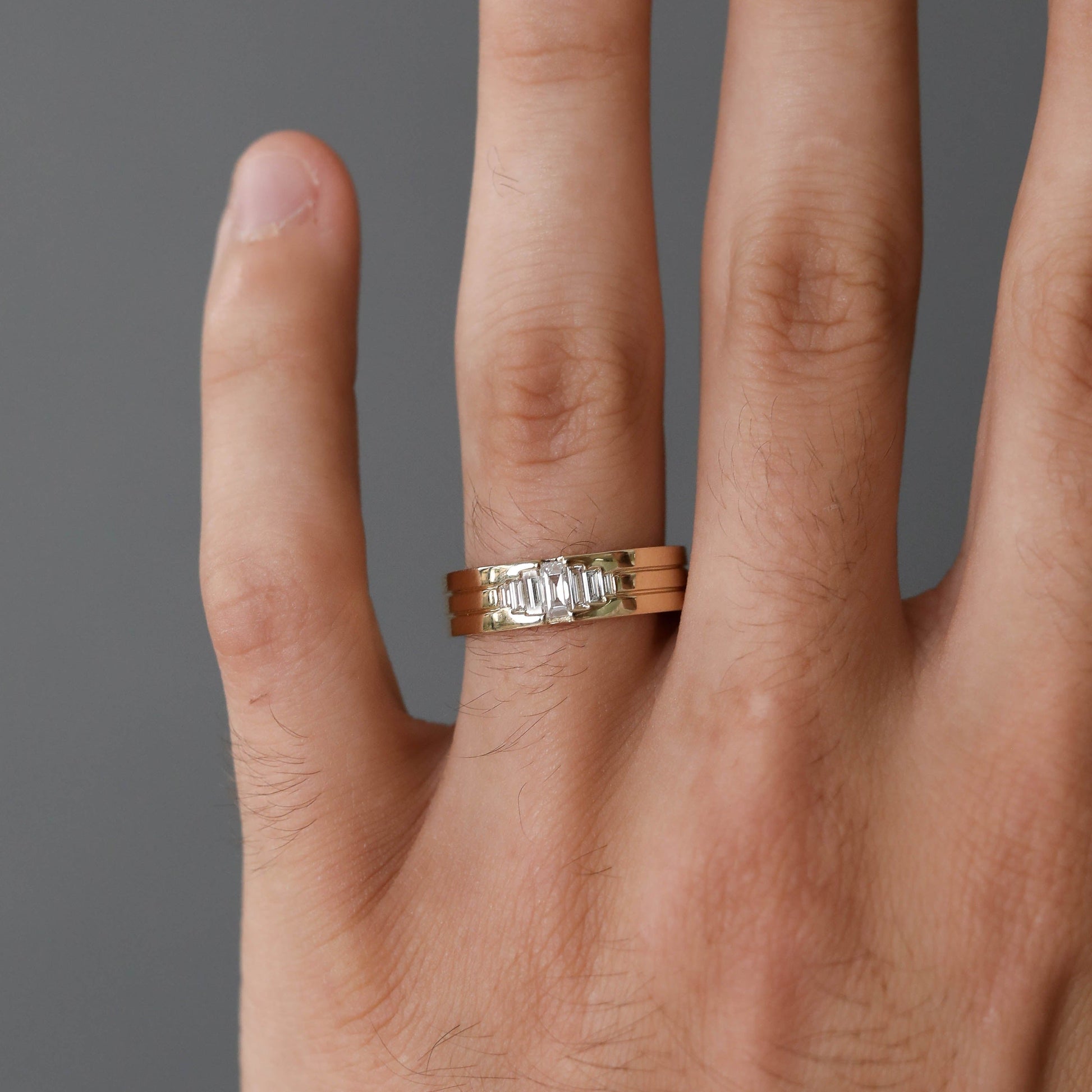 Band Details: ✧ Metal: Gold ✧ Metal Purity: 10K | 14K | 18K ✧ Metal Tone: Yellow | Rose | White ✧ Band Width: 5.0 MM Stone Details: ✧ Type: Moissanite Stone ✧ Shape: Straight Baguette ✧ Weight: 0.5 TCW ✧ Color: DEF ✧ Clarity: VVS We offer free engraving on all our engagement rings and wedding bands. And by this we go one step ahead in expression of love. Please contact us after your purchase with the engraving that you wish to add on the ring.